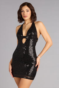 Turn up the sparkle. This halter sequin mini dress stuns with a deep V-neckline, keyhole cutout, and open back that brings high-glam energy to every entrance.