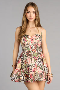 Playful yet polished, the Karla A-line mini dress is designed for moments that call for a confident, fashion-forward look. A corset-inspired bodice meets a flirty A-line mini fit, while leopard and floral prints create a striking mix that feels elevated and unforgettable.