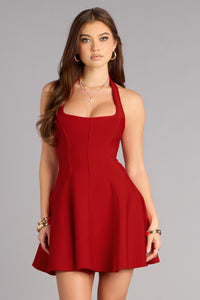 This halter mini dress is doing everything — plunging neckline, open back drama, and a front sash detail that hits just right. The sleek, body-hugging fit creates a sculpted silhouette while the soft stretch fabric keeps it comfortable for dinner and dancing.