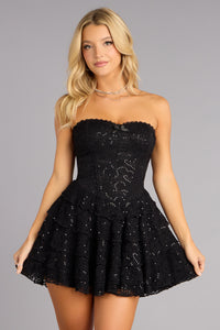 She’s sweet, she’s bold, and she knows the plan. This strapless lace mini brings soft sparkle and a cinched silhouette that feels equal parts flirty and put-together—perfect for dressy celebrations, parties, or special date nights!