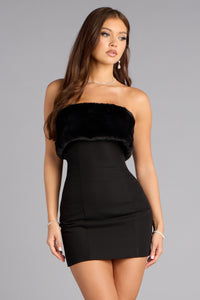 Cool-girl glam, but make it cozy. This faux fur tube mini dress blends sleek confidence with a soft touch—perfect for nights when the vibe is effortless luxury.