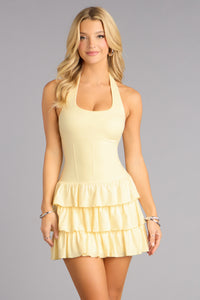 Romantic, flirty, and very intentional. This halter skater dress balances a sculpted bodice with airy tiered ruffles for that effortlessly pulled-together look that always photographs well.