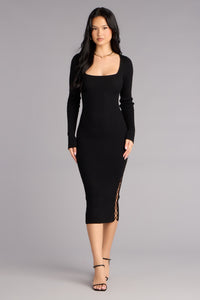 This is the kind of dress that holds eye contact a second longer. Clean lines up front with a subtle lattice moment down the side make it feel polished, confident, and a little unexpected.