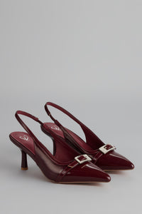 Classic with a little sparkle. These patent slingback heels feature a sleek pointed toe and rhinestone buckle detail that instantly elevates any look—from boardroom days to after-hours drinks.