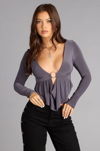 Easy drape, instant impact. This long sleeve crop top features a soft cowl front with a hoop detail that feels relaxed, flattering, and effortlessly styled.
