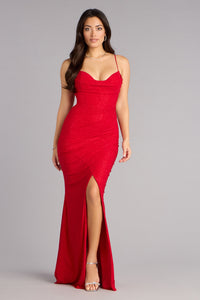 Made for that sweeping, cinematic entrance, the Katalia gown shimmers in glitter with a softly draped cowl neck and sculpted mermaid silhouette. A high front slit adds fluid movement and a touch of allure, turning every step into a moment worth remembering.