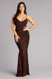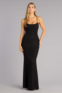 Soft shimmer meets sleek sophistication in the Aubree, a glitter-dusted mermaid gown designed to contour and captivate. The refined scoop neck and dramatic cutout back with lace-up detailing bring modern allure to a floor-length silhouette made for unforgettable evenings.