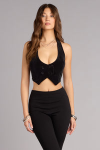 This structured halter vest delivers a luxe texture with a sharp, fashion-forward edge. The cropped length and tailored shape make it perfect for styling solo or layered.
