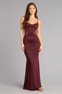 Designed for evenings that call for quiet allure, the Alyce knit mermaid dress skims the body with fluid ease and refined detail. A soft cowl neckline meets side lace inserts and a low back, creating a look that feels polished yet undeniably striking.
