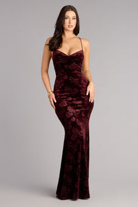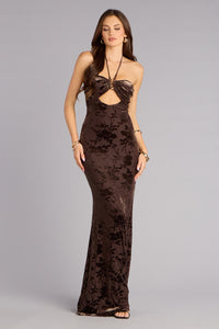 Designed for the woman who knows how to command a room, the Kilah glides in flocked velvet with a striking halter neckline and sculpted cutout bust. The mermaid floor-length silhouette adds effortless drama and movement, creating a look that feels polished, romantic, and unforgettable.