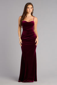 Crafted for the moments that beg for something timeless and quietly stunning, this velvet gown glides with refined ease. The sweetheart neckline draws the eye with soft, sculpted romance, while the pleated mermaid floor-length hem creates a beautifully fluid, statuesque finish.