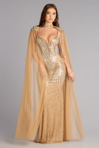 Made for entrances that linger long after the room settles, the Kayte mermaid gown delivers drama with a refined point of view. Rhinestone and gemstone embellishments trace the silhouette while a sweeping floor-length cape adds movement worthy of the occasion.