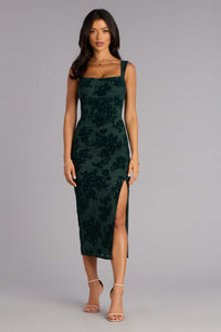 Soft florals meet sculpted elegance in the Emme flocked mesh midi dress, designed with a square neckline and wide tank straps for a clean, modern feel. The side slit adds just the right amount of drama, while the pleated detailing shapes everything beautifully.
