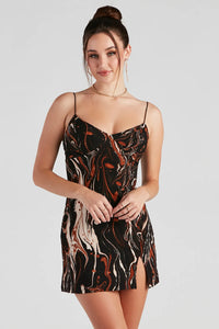 Perfectly swirled and smoothed to perfection! Showcase a head-turning look in this sleeveless mini dress featuring a v-neck, bungee spaghetti straps, bodycon silhouette, slit accent, and a marble print on brushed knit fabric. Complete the look in lace-up heels for a summer party.