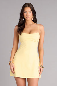 Soft, sleek, and ready for whatever your calendar throws at you. This sweet A-line mini dress hugs just right, moves effortlessly, and brings a smooth, polished look to any plan.