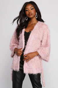 Go for shaggy chic in this fab jacket! This fashionista-approved jacket features a draped open front, 3/4 length sleeves, and a tie waist belt with loops. The jacket is composed of a combination lined shaggy knit fabric with eyelash knit. The jacket offers a relaxed fit with minimal stretch. Complete look with high waist skinny jeans.