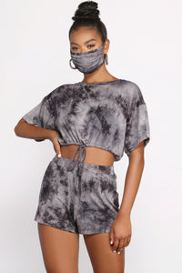 Keep it trendy in tie-dye shorts that give off major boho vibes. The shorts feature an elastic high rise waist, a cheeky fit, and an all-over tie-dye print. Complete your look with the matching top and face mask.