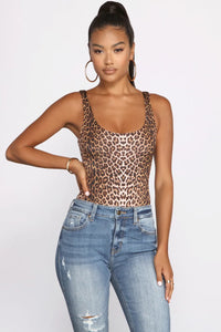 Keep it wild in a bodysuit that unleashes your fierce style. The bodysuit features a scoop neckline, tank-like straps that offer support, and an all-over leopard print. Complete your look with high waist jeans for a chic look.