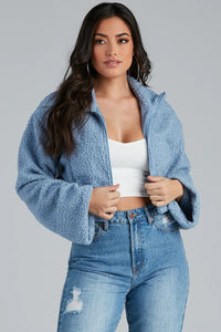 Get that laidback, chill vibe with this adorable cropped jacket. It features a collared neckline, zip-front, long flare sleeves, and a relaxed fit. Style this trendy jacket with your fave pair of boyfriend jeans and combat boots.