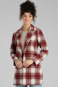 Bring that major chic vibe this season with a trendy coat! The coat features a plaid print, a draped open front, long sleeves, hidden side pockets, and a longline length. The jacket is composed of a faux wool fabric that offers a relaxed fit with minimal stretch. Complete look with thigh-high boots and skinny jeans.