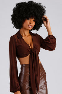 You'll have lots of fun styling this tie-front top featuring puff long sleeves, a collared plunge neckline, and a self-tie cropped hem. Composed of a smooth knit fabric offering a moderate stretch. Complete the look with dangly earrings and jeans.