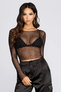 This straight up glam heat stone adorned top is perf for your next night out. It features a raw cut crew neckline, long fitted sleeves, and a mid-length raw cut hem with an overall form hugging fit. The sheer fish net fabric offers moderate stretch.Style Number/Barcode: 06001-1694