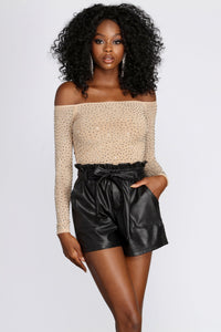 Set off sparks as you strut in this dazzling crop top! It features an off the shoulder square neckline, long fitted sleeves, and a short hem that hits mid-torso. The stretchy knit fabric offers a form hugging fit and is adorned with all over gleaming heat stones.Style Number/Barcode: 06001-1701