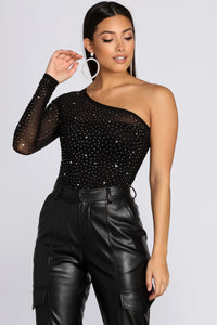 Bring the heat with this night out worthy bodysuit! It features a one shoulder neckline with a single long fitted sleeve and a thong bottom with dual snap button closures. The top of the bodysuit is composed of a sheer mesh adorned with all over heat stones, and the bottom is composed of a stretchy knit fabric. Includes a partial knit lining.Style Number/Barcode: 06001-1878
