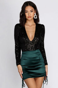 Steal the spotlight in stunning sequins with this beyond gorg bodysuit! It features a deep V neckline, long fitted sleeves, a back zipper and hook and eye closure, and a knit thong bottom with dual snap button closures. Bodysuit is adorned with all over sequins and offers moderate stretch.