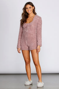 Soft and fuzzy, this adorable PJ romper couldn't get anymore cozy. It features long sleeves, a scoop neckline, a half button up front, and fitted shorts. The fuzzy faux fur fabric has minimal stretch.