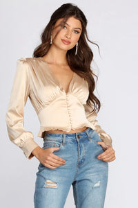 Sleek with its satin fabric, this button detail blouse will dress up your everyday look. It features a V neckline, long sleeves with three buttons to cuff, pleated details across the chest, button down details, a hidden side zipper closure, and a mid-length, ruffle trim hem. The satin-like fabric has no stretch.Style Number/Barcode: 06003-0502