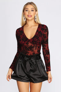 Charm them all with this must have bodysuit! It features a partially lined V neckline, long fitted sleeves and a thong bottom with snap button closure. Bodysuit is composed of a sheer mesh fabric adorned with a flocked velvet detail throughout. Bodysuit offers a form hugging fit with a moderate stretch.