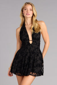 Soft texture, major movement. This flocked velvet mesh mini dress features a halter keyhole neckline and open tie-back design that brings the perfect mix of flirty and elegant for your next night out.