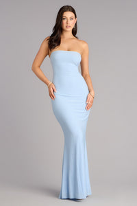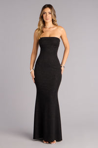Effortlessly refined with a touch of quiet shine, this glitter knit mermaid gown is made for evenings that feel elevated from the start. A strapless padded neckline highlights the shoulders, while the floor length silhouette skims the body with clean, graceful lines.