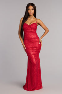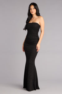 Make an unforgettable entrance in the Allie glitter formal dress. Crafted with shimmering glitter throughout, the dress features an elegant lace-up back and ruched mermaid silhouette that flatters your curves while creating a graceful flow.