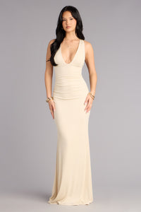 This is the kind of dress that doesn’t rush the moment—it owns it. With a plunging cowl neckline, subtle shimmer, and an open back, this maxi brings a slow-burn kind of drama that feels effortless and unforgettable.