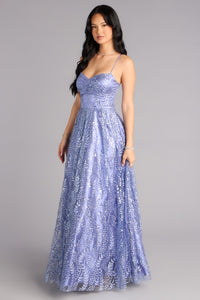 Designed for entrances that feel intentional and unforgettable, the Abby glitter gown moves with effortless drama. The A-line voluminous floor length silhouette is balanced by a lace-up back and hidden side pockets for a look that enchants.