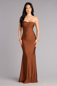 Designed to command attention, the Gina formal gown blends sleek satin with sculpted detailing for a look that defines modern allure. The strapless scoop neckline and corset bodice accentuate every curve, while ruched cutouts and a floor-length mermaid silhouette bring pure red-carpet energy to any event.