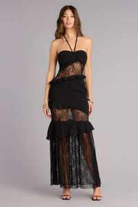 Save the Date Lace Halter Ruffle Maxi Dress