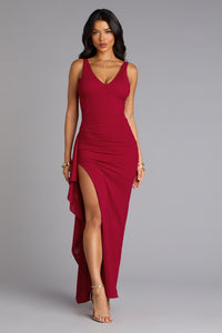 Turn heads all night in the Ayden ruffle high slit mermaid dress that’s sleek, flirty, and made to move. With its curve-hugging fit and dramatic slit, it’s the ultimate mix of sultry and chic for your next party.
