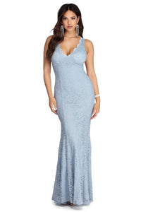 Special OccasionStep out in our shimmering Cadence dress to shine from your best angles! She features a light blue color, a V neckline with a scalloped lace trim, padded cups and a single button closure at the nape of the neck. Her back features a sheer lace panel and an open back design. Her slim fit bodice leads to an elongating floor length silhouette with a flared hemline. Dress is composed of a lined lace fabric adorned with glitter accents while offering a curve hugging fit with a slight stretch.