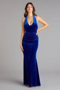 Sleek and sultry, the Estella velvet gown is designed with a plunging halter neckline that flows into an open back and a floor-sweeping hem. The form-hugging fit and subtle ruching at the waist ensure a silhouette that’s as timeless as it is striking.