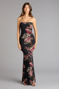 A dress made for dreamy nights and picture-perfect entrances. The strapless neckline keeps it sleek, while the floral print adds that touch of romance. With its curve-skimming fit and floor-length hem, this maxi is made to wow at weddings, dinners, or any elegant night out.