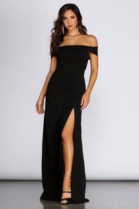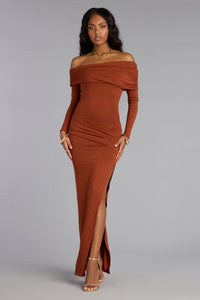 This off-the-shoulder maxi dress features ruched details that contour your shape, plus a high side slit for effortless allure. Perfect for shower celebrations, formal dinners, or anytime you want all eyes on you.