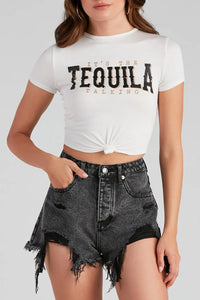 It's The Tequila Talking Graphic Tee It's The Tequila Talking Graphic TeeLive your best life with this fun graphic tee that says it all! It features a crew neckline, short sleeves, a center script that reads "It's The Tequila Talking," and a cropped fit with a cute knot-front detail. Complete the look with distressed denim and hoop earrings. Fit & Features - Crew neckline