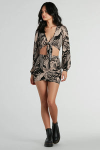 Tropical Day Dream Tie-Front Crop Top Tropical Day Dream Tie-Front Crop TopLook like a tropical day dream in this crop top while on vacation! The flowy long sleeves with banded cuffs ensure a comfortable fit, while the tie-front closure and vibrant tropical print add a touch of paradise to your outfit. Complete the look with the matching pants and skirt. Shop Matching Pants: Tropical Day Dream High-Rise Wide Leg Pants
