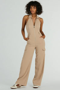 Traveling Cute Halter Wide-Leg Cargo Jumpsuit Traveling Cute Halter Wide-Leg Cargo JumpsuitTravel cute wherever you're heading in this sleeveless woven jumpsuit for a chic and polished vibe! The halter collar neckline and front zipper closure provide a classic and utility touch, while the open back with an adjustable strap flaunts some skin, and side and flap pockets offer functionality along the wide-leg silhouette. Complete the look with a trendy shoulder handbag. Fit & Features - Woven fabric