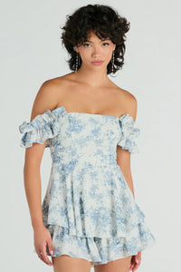 Pretty Girl Ruffled Off-The-Shoulder Scenic Print Romper Pretty Girl Ruffled Off-The-Shoulder Scenic Print RomperShowcase your beauty in this effortlessly pretty printed off-the-shoulder romper! The lightweight lined woven fabric features a charming scenic print for those adorable coquette vibes. The romper is shaped with an off-the-shoulder square neckline with ruffled short sleeves, flexible boning at the bodice to add structure, a high waist with a tie-back design for a cinched look, and a short ruffled overlay over flowy shorts to add chic volume. Style with bow hair clips! Fit & Features - Scenic print, lined woven fabric with no stretch