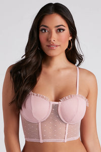 This sheer mesh polka dot longline bra will bring the chic romantic vibes! It features a sweetheart neckline with a padded bust and a dainty ruffled trim, adjustable spaghetti straps, front vertical seams to give the illusion of a corset design, and an adorable all-over polka dot pattern on the sheer mesh fabric. Style with a marabou feather robe.