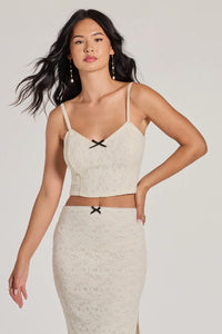 A lace crop top features a flirty V-neckline with a bow accent, spaghetti straps, and a fitted silhouette. The lace-lined fabric offers a romantic feel and stretch.